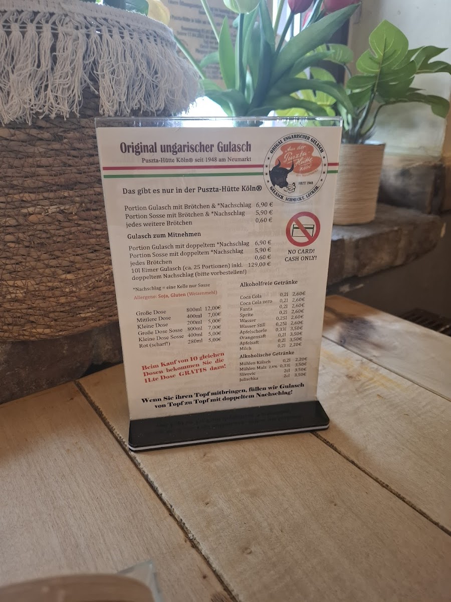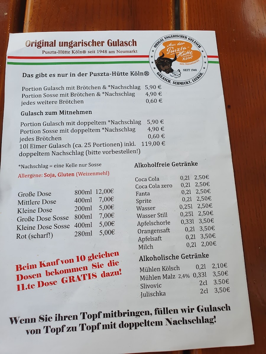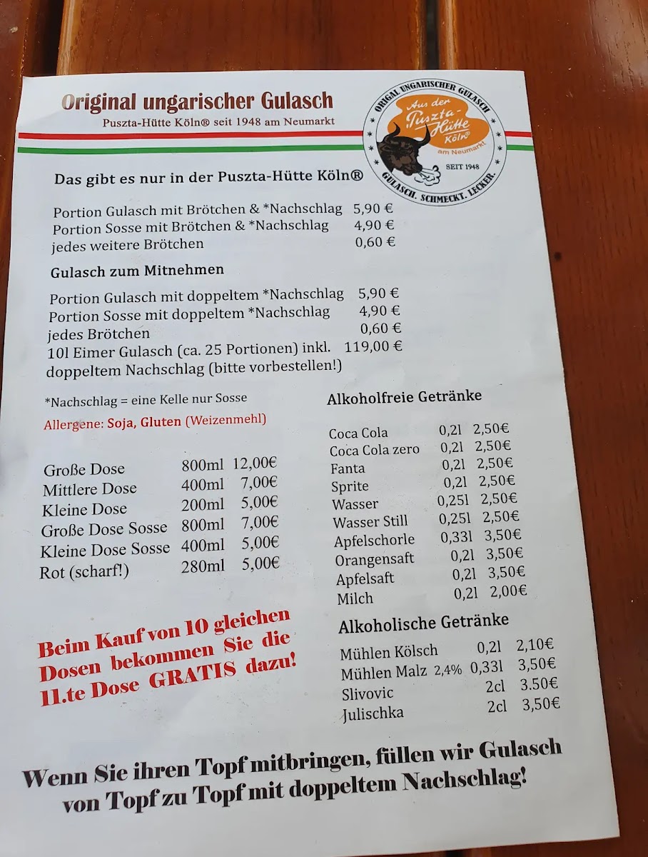 Welcome to Puszta-Hütte, a culinary gem nestled in Köln, where the rich flavors of Hungarian cuisine take center stage. This charming eatery specializes in a single, iconic dish: mouthwatering goulash served with fresh bread. Priced affordably at €5.90, the goulash has earned rave reviews for its delightful balance of spices, making it a must-try for both locals and visitors alike.