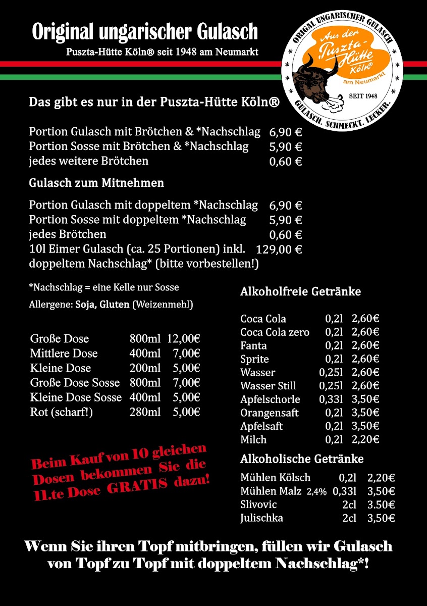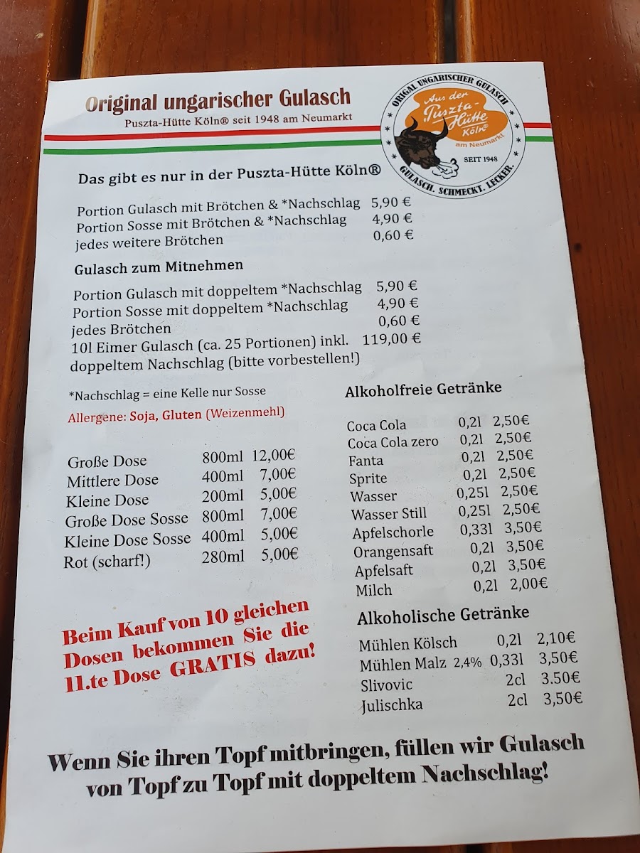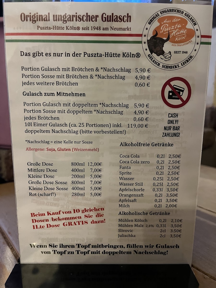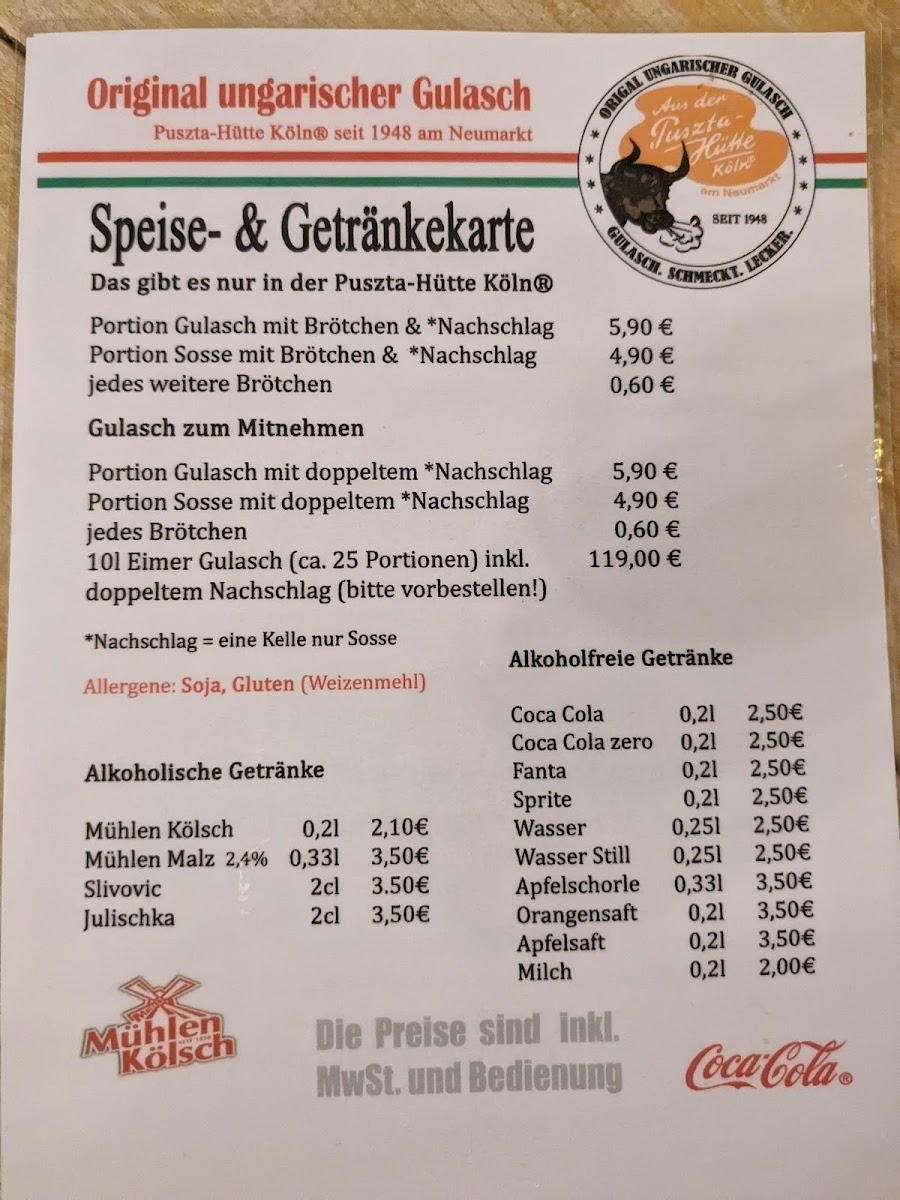Welcome to Puszta-Hütte, a culinary gem nestled in Köln, where the rich flavors of Hungarian cuisine take center stage. This charming eatery specializes in a single, iconic dish: mouthwatering goulash served with fresh bread. Priced affordably at €5.90, the goulash has earned rave reviews for its delightful balance of spices, making it a must-try for both locals and visitors alike.